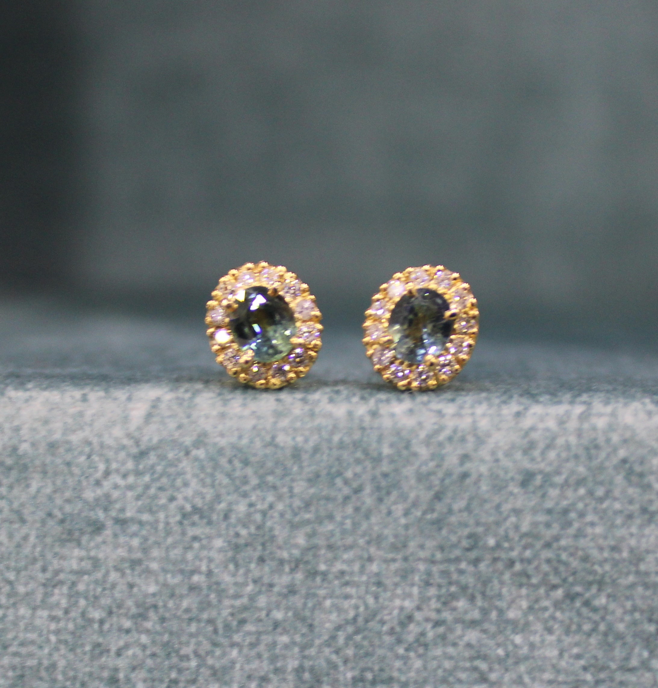 Handmade Bluish Green Sapphire and Diamond Earrings in 18kt Yellow Gold