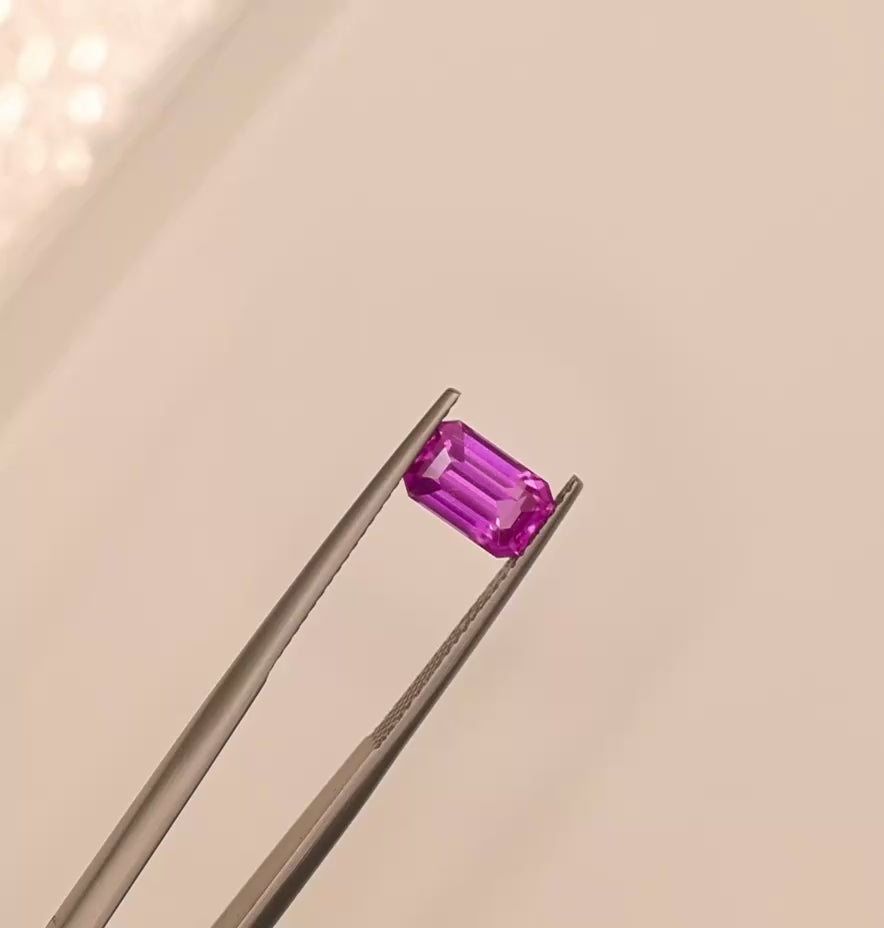 This breathtaking 2.04 carat natural hot pink sapphire from Madagascar is truly one of a kind. Measuring 8.81 × 5.39 × 4.15 mm, it’s cut in a perfectly symmetrical emerald shape—a style that’s rarely seen in sapphires, as it requires exceptional clarity to achieve.