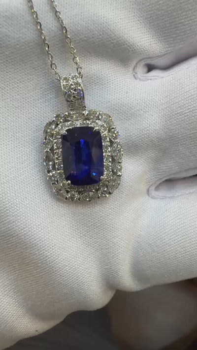 Elevate your fine jewellery collection with this luxurious Ceylon Sapphire and diamond pendant, meticulously handcrafted in our own workshop. At its centre is a stunning 3.56ct natural vivid blue sapphire, cut in a rectangular cushion shape to showcase its exceptional brilliance and depth. Known for their unmatched colour quality, Ceylon Sapphires are among the most prized in the world—and this one is no exception.